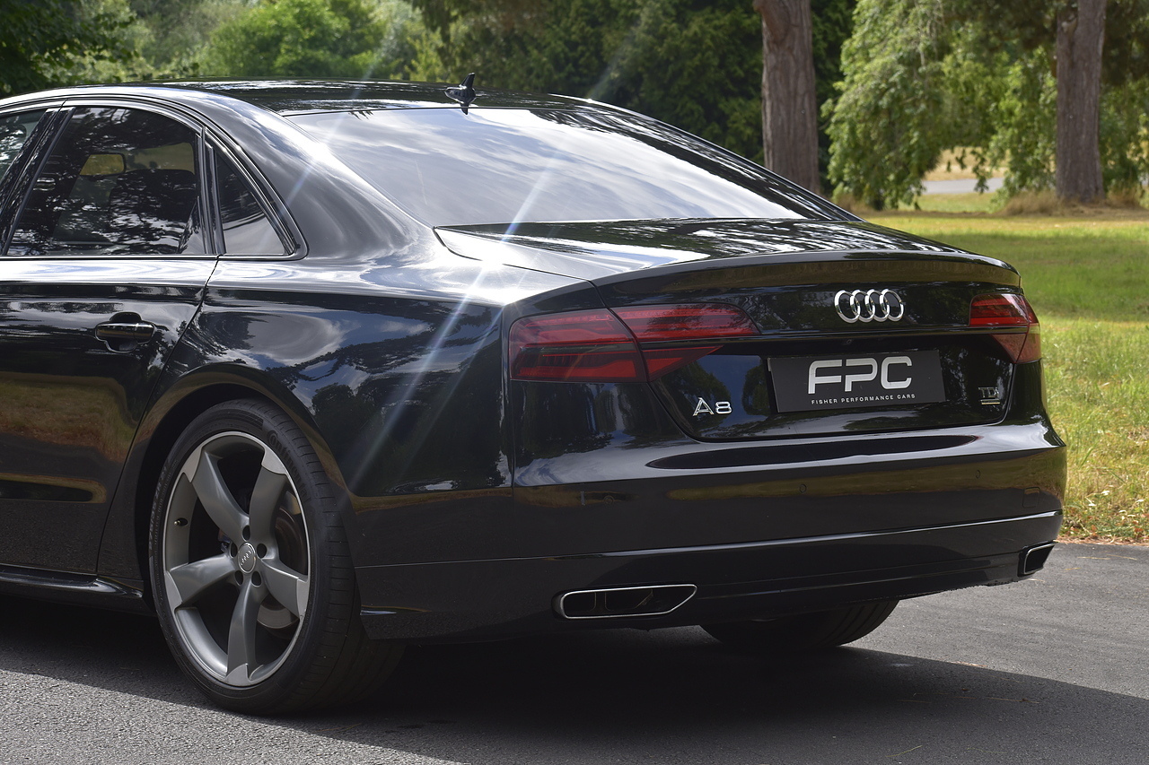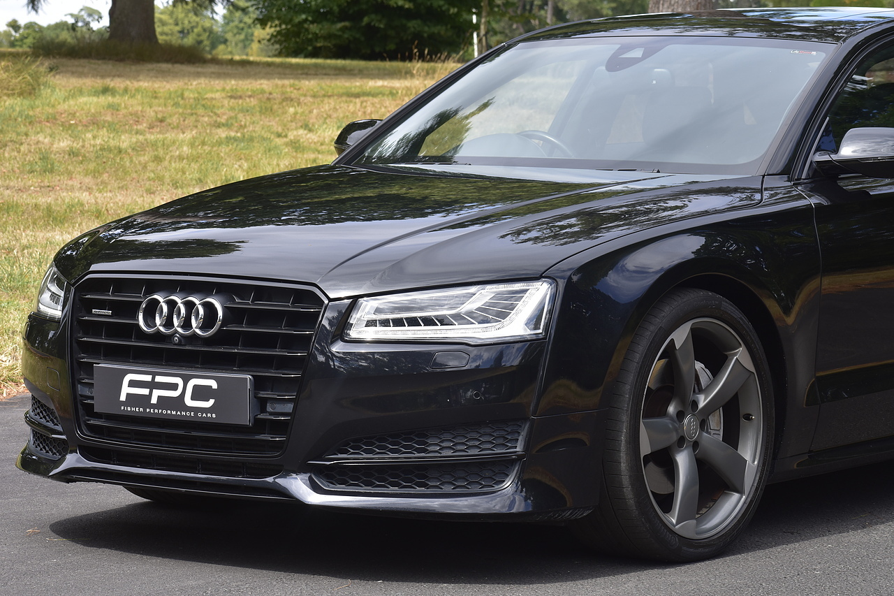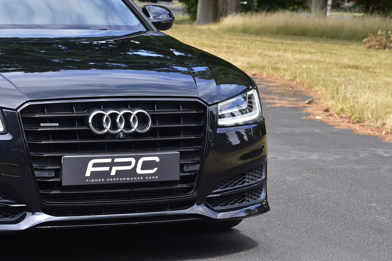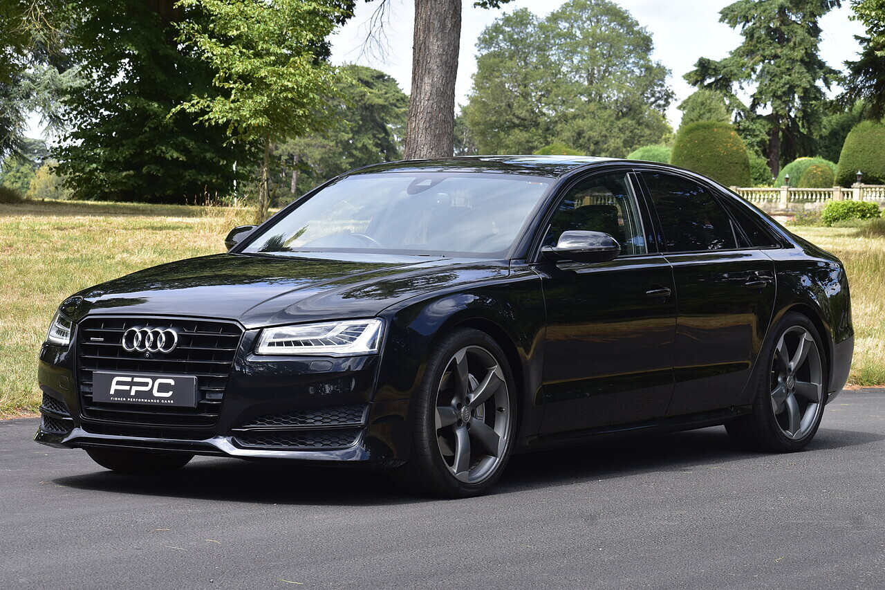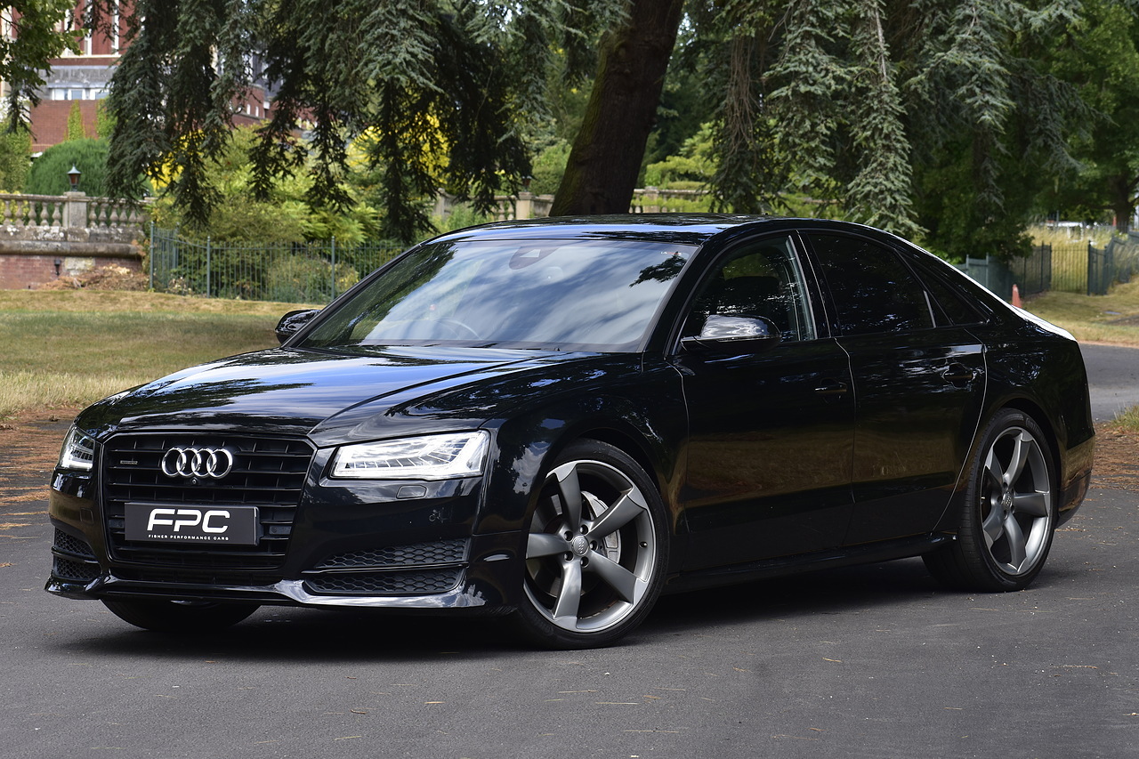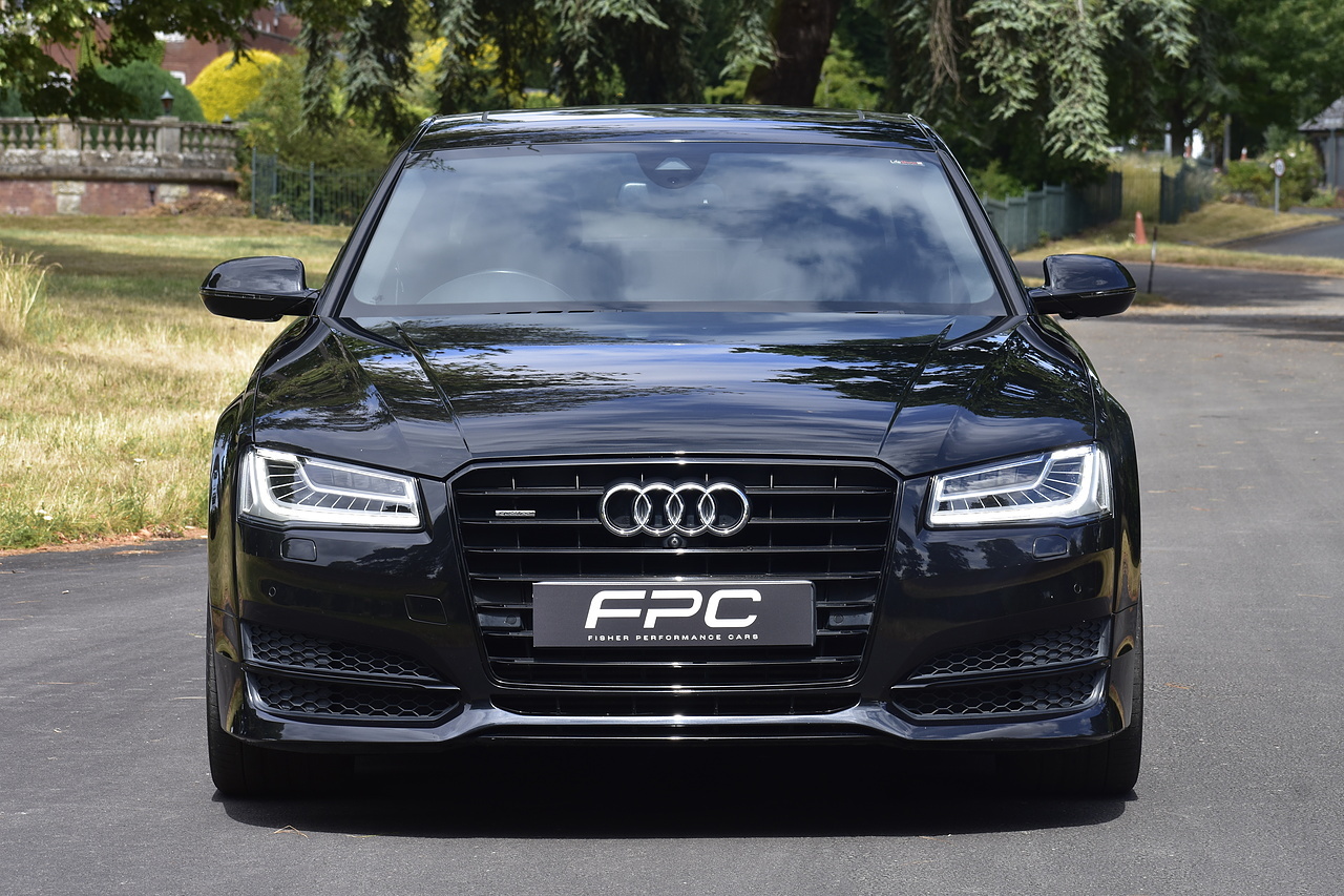 Fisher Performance Cars are proud to offer for sale this superb Audi A8 Black Edition finished in Mythos Black over Black Valcona Comfort Seats. This vehicle boasts only 2 careful owners from new and is complimented with a superb service record, as shown below. It is presented in lovely condition throughout with only minor age commensurate wear. It is specified with an Electric Glass sunroof, Bose surround sound system (STUNNING QUALITY), heated rear seats and Deluxe 4-Zone Climate.