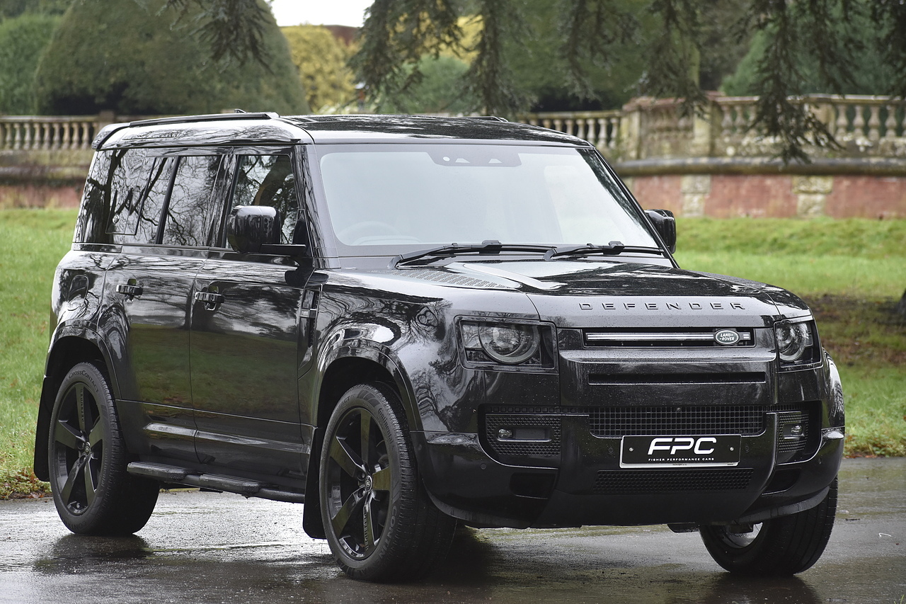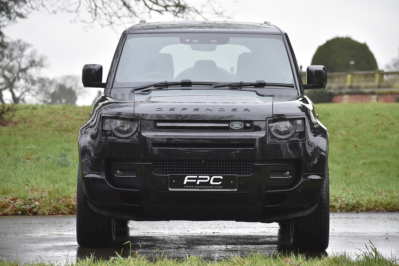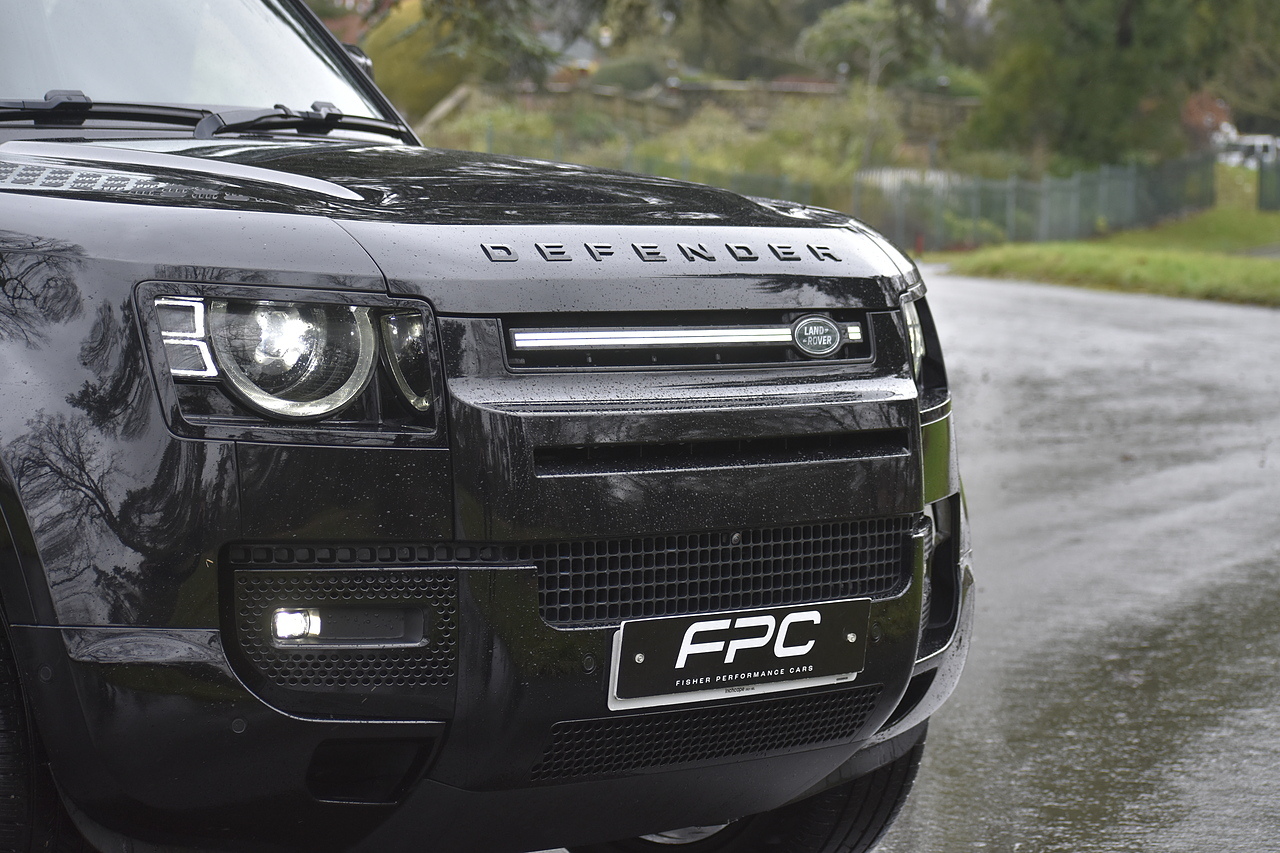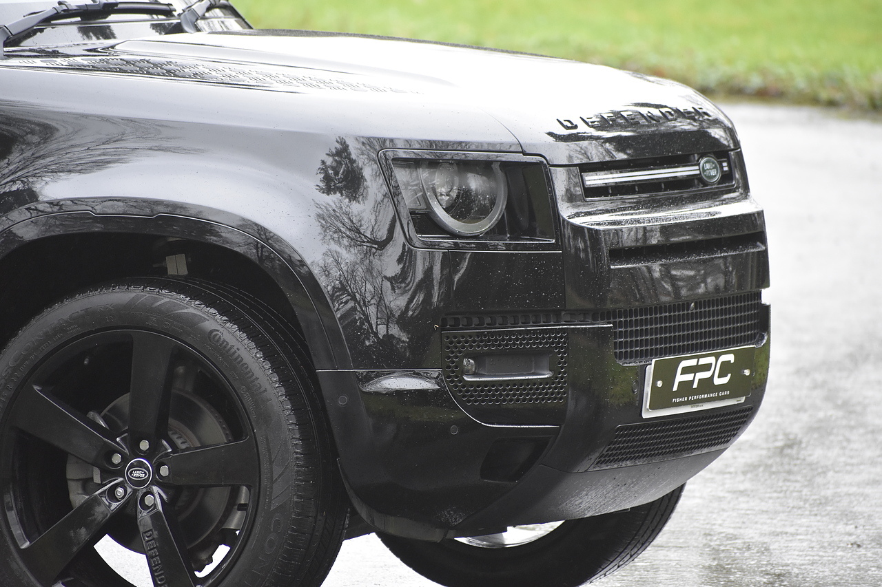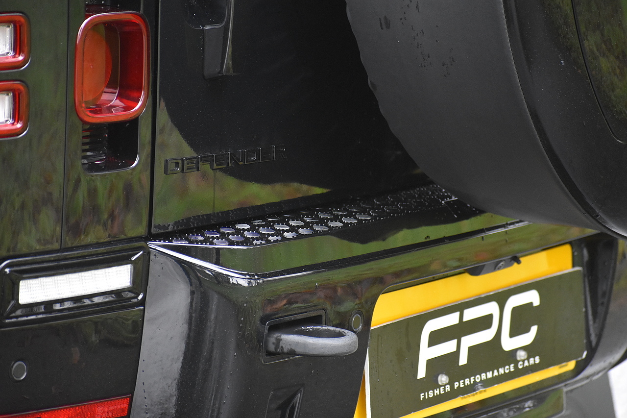 Fisher Performance Cars are proud to offer for sale this Land Rover Defender D250 SE finished in Santorini Black over Black leather interior. This example is presented in excellent condition throughout and boasts only 1 owner from new. Specification wise, this Defender is fitted with a Sliding Sunroof, 22" Gloss Black alloys, full exterior Black Pack, Roof Spoiler, Grille Light, LED Side Vents, Fixed Black side steps and upgraded reverse lights. Servicing wise, this has already had it's first 24 month service so isn't due until October of 2026.