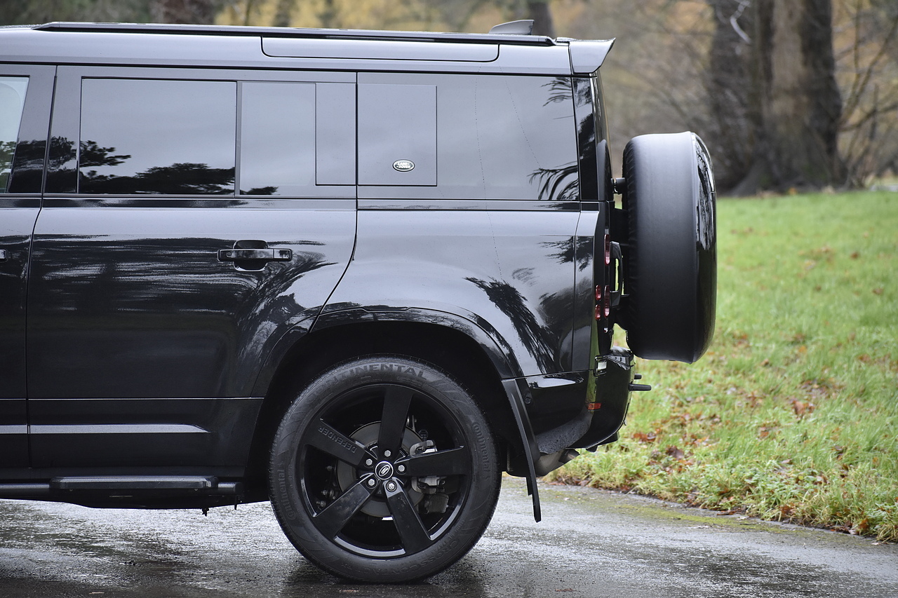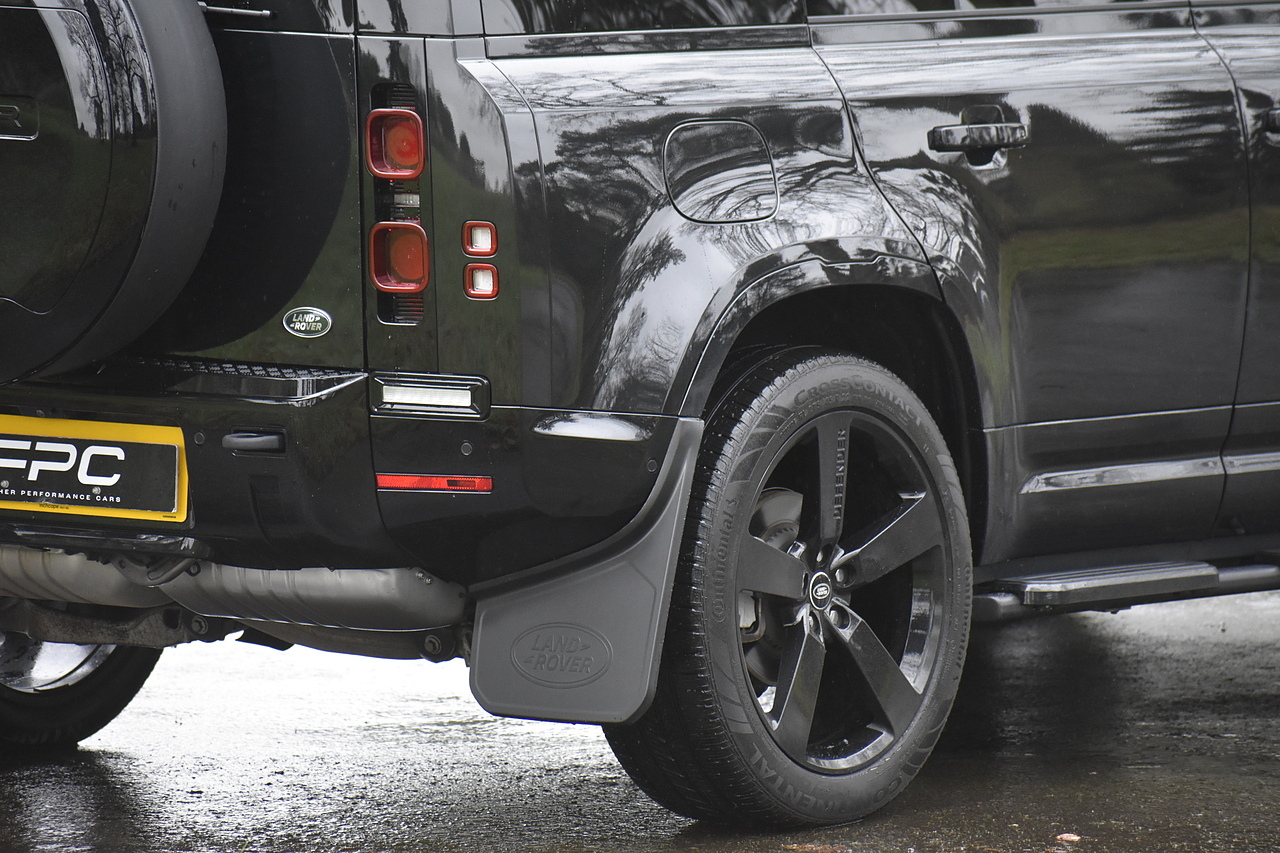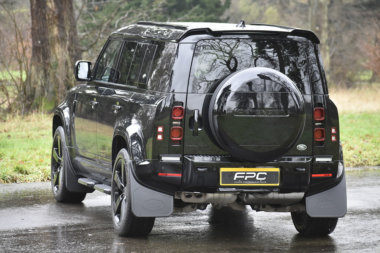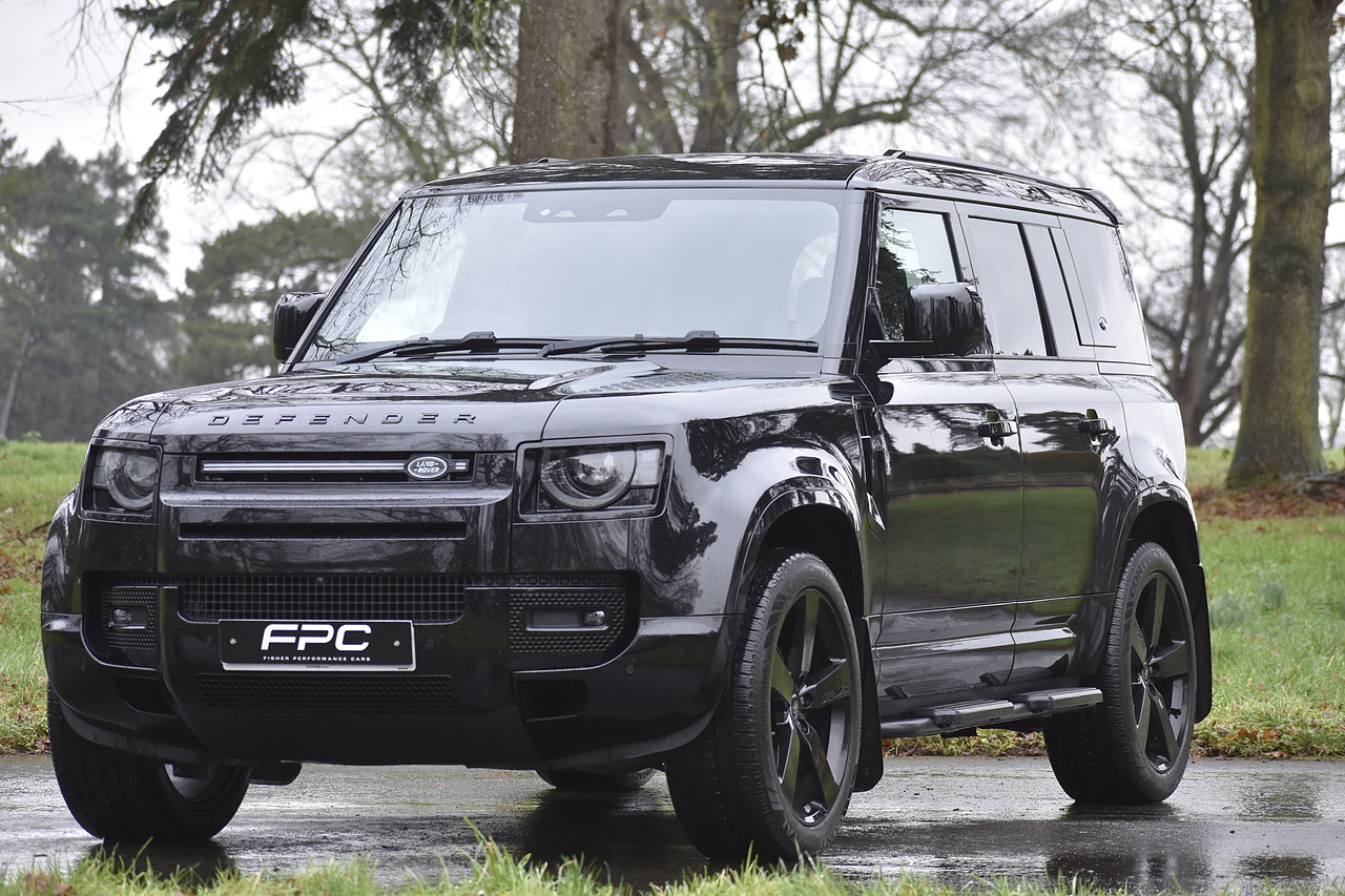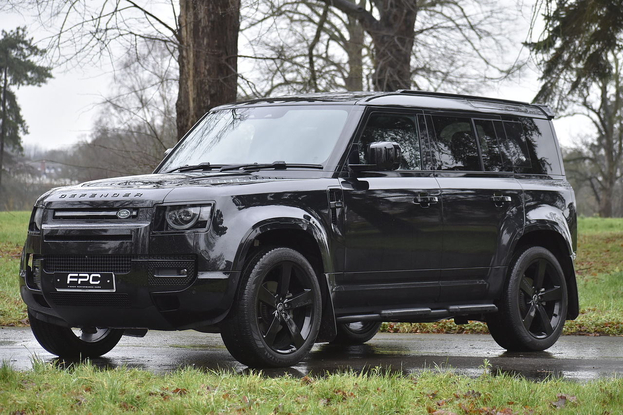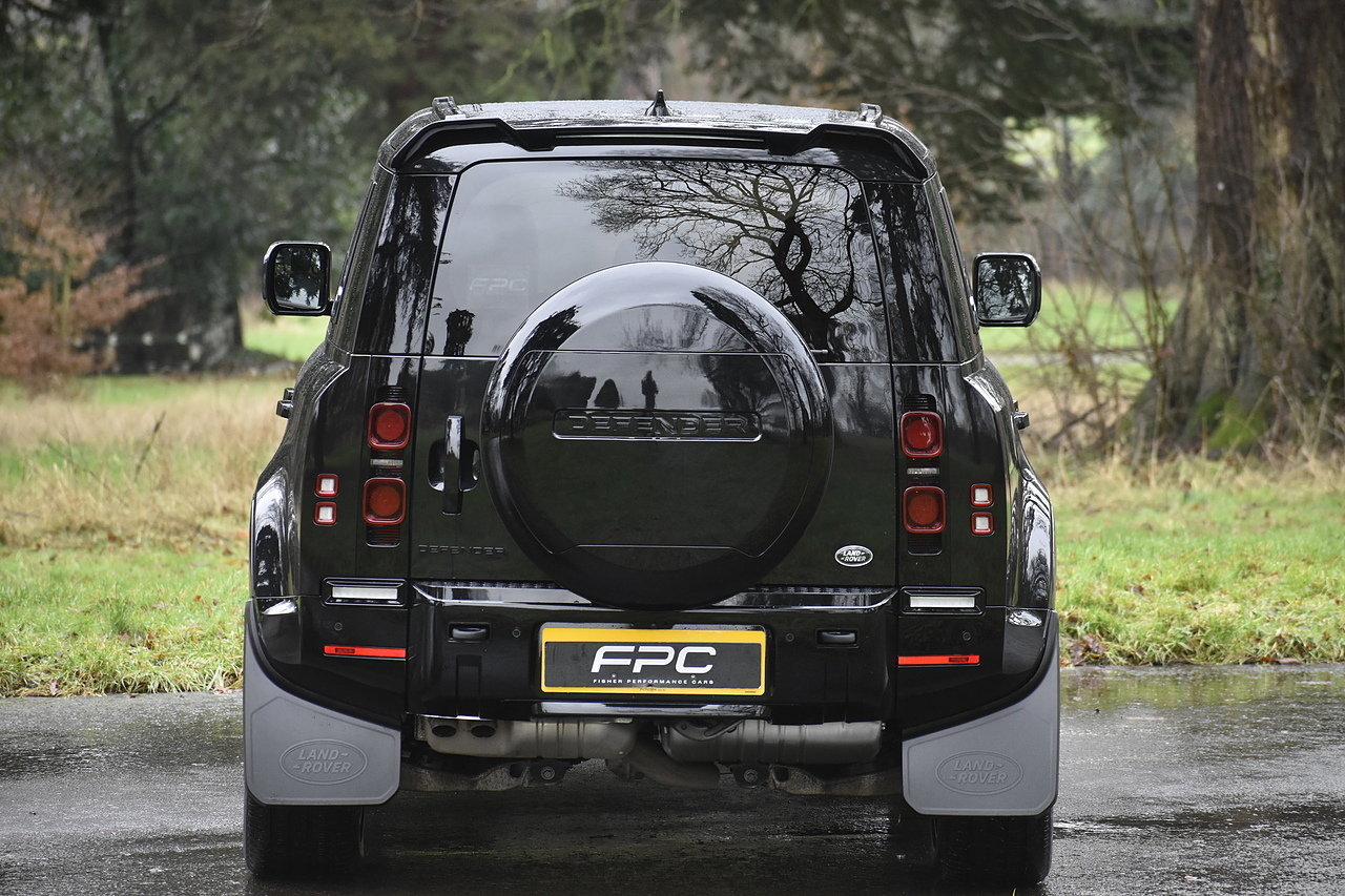 Fisher Performance Cars are proud to offer for sale this Land Rover Defender D250 SE finished in Santorini Black over Black leather interior. This example is presented in excellent condition throughout and boasts only 1 owner from new. Specification wise, this Defender is fitted with a Sliding Sunroof, 22" Gloss Black alloys, full exterior Black Pack, Roof Spoiler, Grille Light, LED Side Vents, Fixed Black side steps and upgraded reverse lights. Servicing wise, this has already had it's first 24 month service so isn't due until October of 2026.